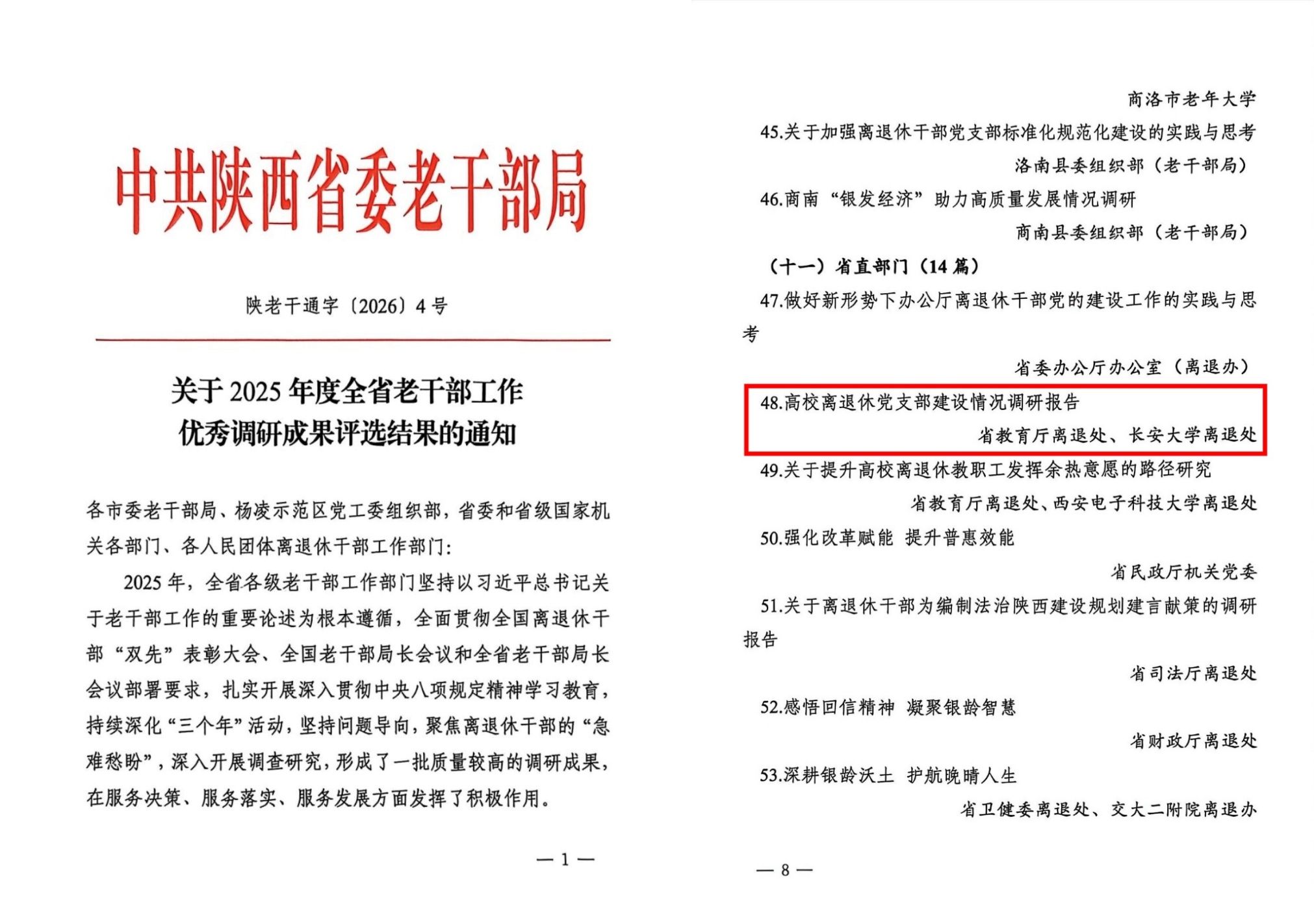 近日,中共陕西省委老干部局发布2025年度全省老干部工作优秀调研成果评选结果,我校离退休处党总支牵头组织完成的《高校离退休党支部建设情况调研报告》获评2025年度全省老干部工作优秀调研成果。