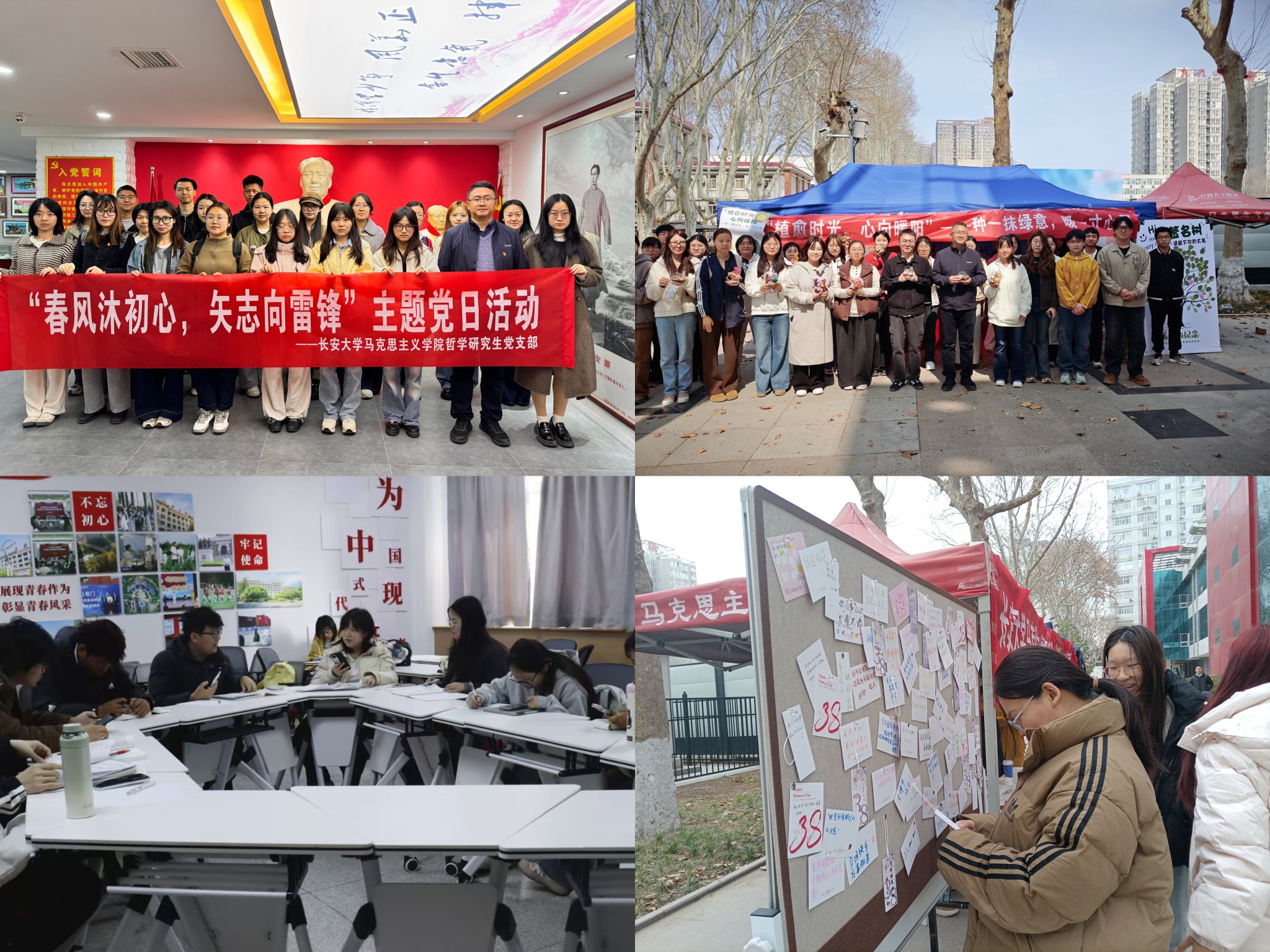 深耕校园实践,让雷锋精神落地生根。学院哲学研究生党支部赴曲江红色记忆博物馆开展主题党日活动,通过参观红色展馆、聆听专题微党课、参与红色知识问答,在重温革命历史中感悟雷锋精神;开展春季学业帮扶活动,组建优秀学子朋辈互助小组,答疑解惑、分享方法,将奉献精神融入学风建设,营造互帮共进的浓厚氛围;举办“锋华正茂,益起同行”主题活动,书写祝福,致敬榜样;开展“植愈时光,万物生长”实践活动,将生态教育与心理健康教育有机结合,让学子在植绿护绿、文创DIY中践行绿色理念,守护校园生态。
