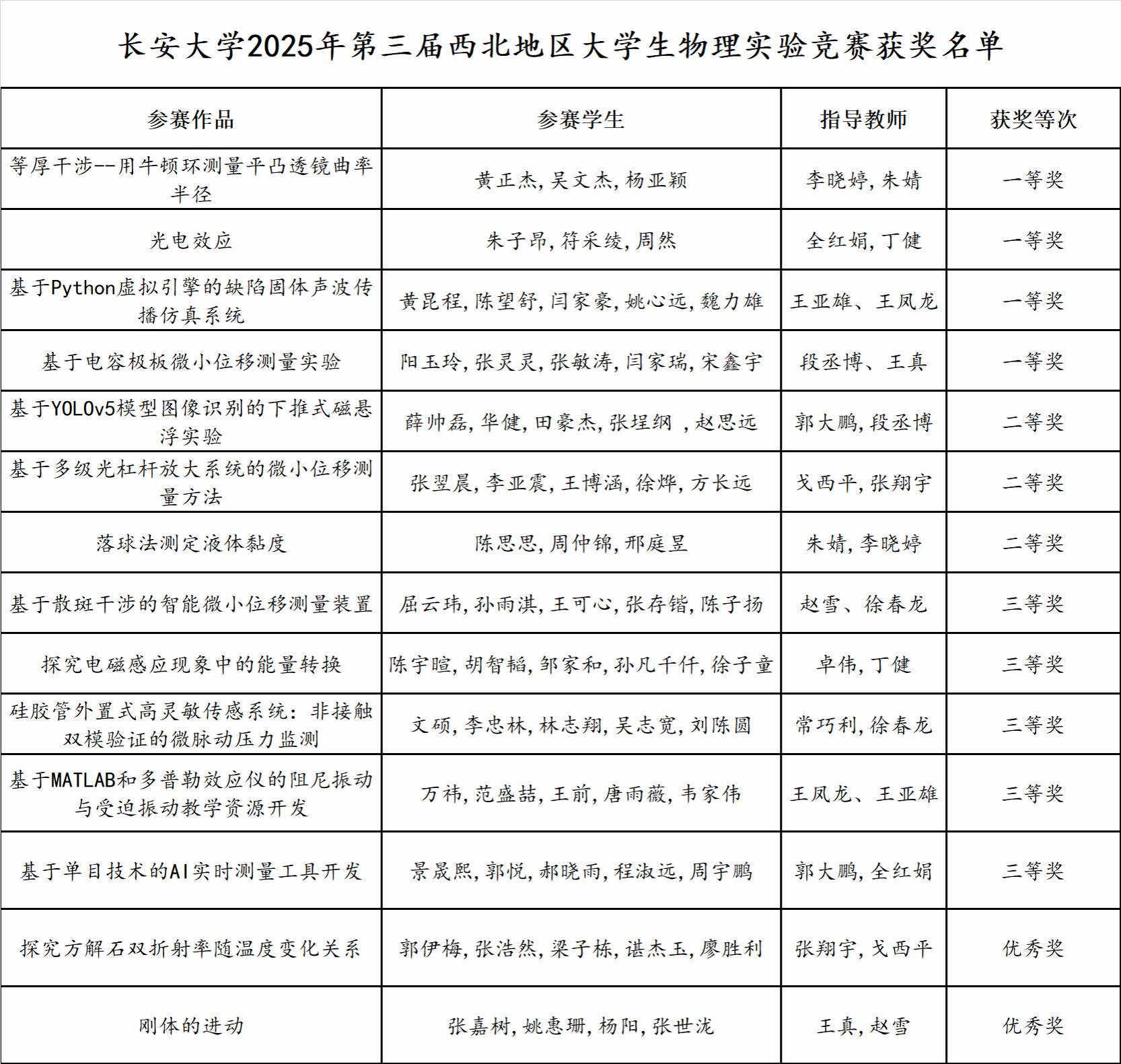 8月25日,2025年全国大学生物理实验竞赛(创新)西北地区赛在西安落下帷幕。我校选派14支代表队参赛,获得一等奖4项、二等奖3项、三等奖4项、优秀奖2项。获奖等次与数量均位列参赛高校前列。本次竞赛由全国大学生物理实验竞赛组委会西北地区分委员会主办,陕西师范大学与西安交通大学联合承办,吸引了来自西北地区59所高校的536支队伍参加竞赛。