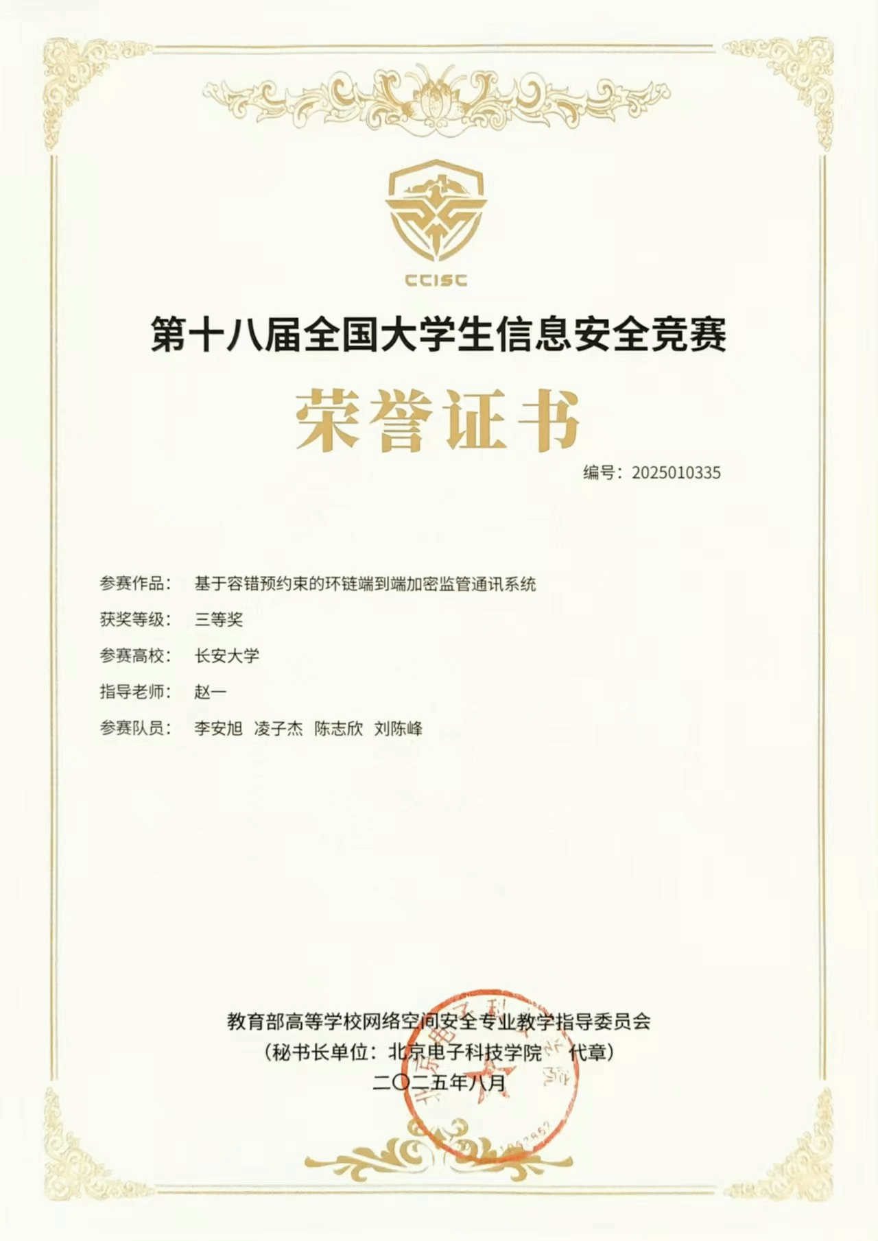 8月14日,第十八届全国大学生信息安全竞赛作品赛决赛在西安交通大学兴庆校区举办,我校信息工程学院李安旭、凌子杰、陈志欣、刘陈峰四位本科生组成的长大网安小队,由赵一老师指导的作品—《基于容错预约束的环链端到端加密监管通讯系统》荣获三等奖。这是我校首次获得该比赛奖项,实现了学校在该赛事奖项上“零的突破”。