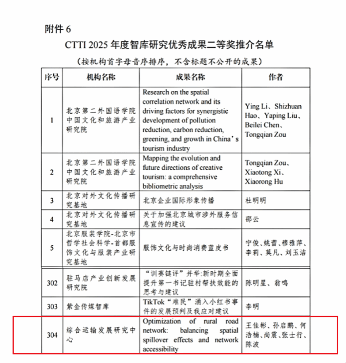 本次论坛公布了CTTI 2025年度来源高校智库百强榜、2025年度智库建设最佳案例与智库研究优秀成果征集与推介结果。由长安大学综合运输发展研究中心王佳彬博士、孙启鹏老师、何浩楠老师、尚震老师、张士行老师和陈波老师共同完成的研究成果《Optimization of rural road network:balancing spatial spillover effects and network accessibility》荣获CTTI2025年度智库研究优秀成果二等奖。