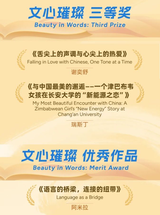 获奖的四名国际学生分别来自卢旺达、俄罗斯、津巴布韦、马尔代夫四个国家,他们以在中国的亲身经历为蓝本,将跨文化的感悟凝练成细腻文字,让世界看到了一个可感、可触、有温度的中国。来自卢旺达的优秀校友马伟凭借作品《饮水思源:我就是最好的中国制造》摘得“文心璀璨”一等奖,其作品以个人成长轨迹为线索,诠释了在华学习生活的收获与感悟,字里行间满含对中国文化与发展理念的认同;俄罗斯籍国际学生谢奕舒的《舌尖上的声调与心尖上的热爱》、津巴布韦籍瑞斯丁的《与中国最美的邂逅——一个津巴布韦女孩在长安大学的“新能源之恋”》荣获三等奖,两篇作品分别从饮食文化、专业学习与校园生活出发,描绘了在中国的暖心日常与成长故事,视角鲜活、情感真挚;马尔代夫籍优秀校友阿米拉的《语言的桥梁,连接的纽带》获优秀奖,作品聚焦语言交流在跨文化沟通中的重要意义,传递了中外青年相知相交的美好情谊。