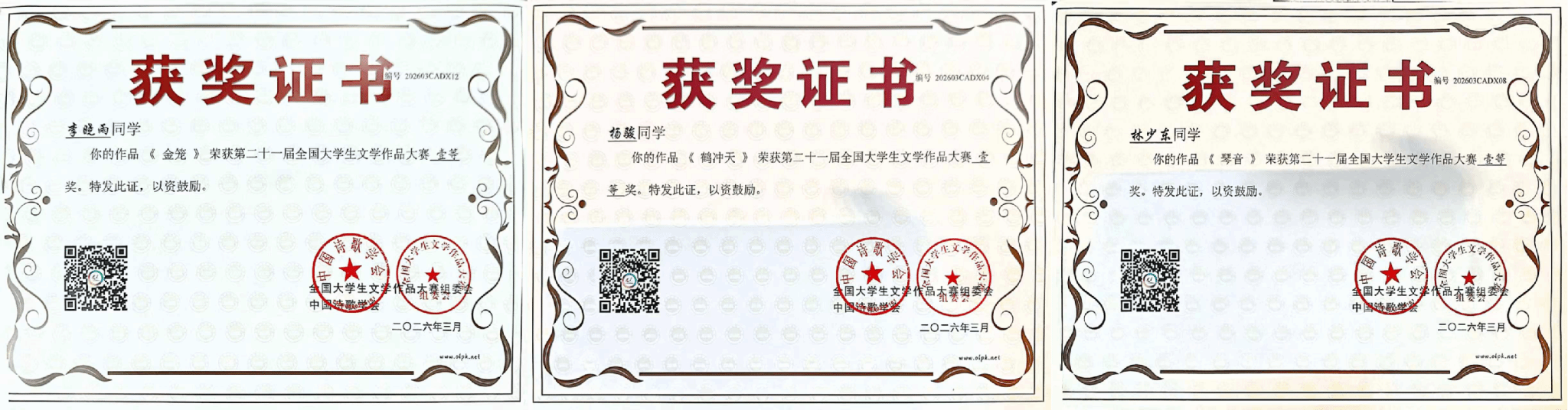 近日,第二十一届全国大学生文学作品大赛获奖名单正式揭晓。我校人文学院积极组织全校学子参赛,共计征集稿件382篇,最终获得国家级一等奖3项、二等奖10项、三等奖26项,人文学院多名教师荣获优秀指导教师奖。