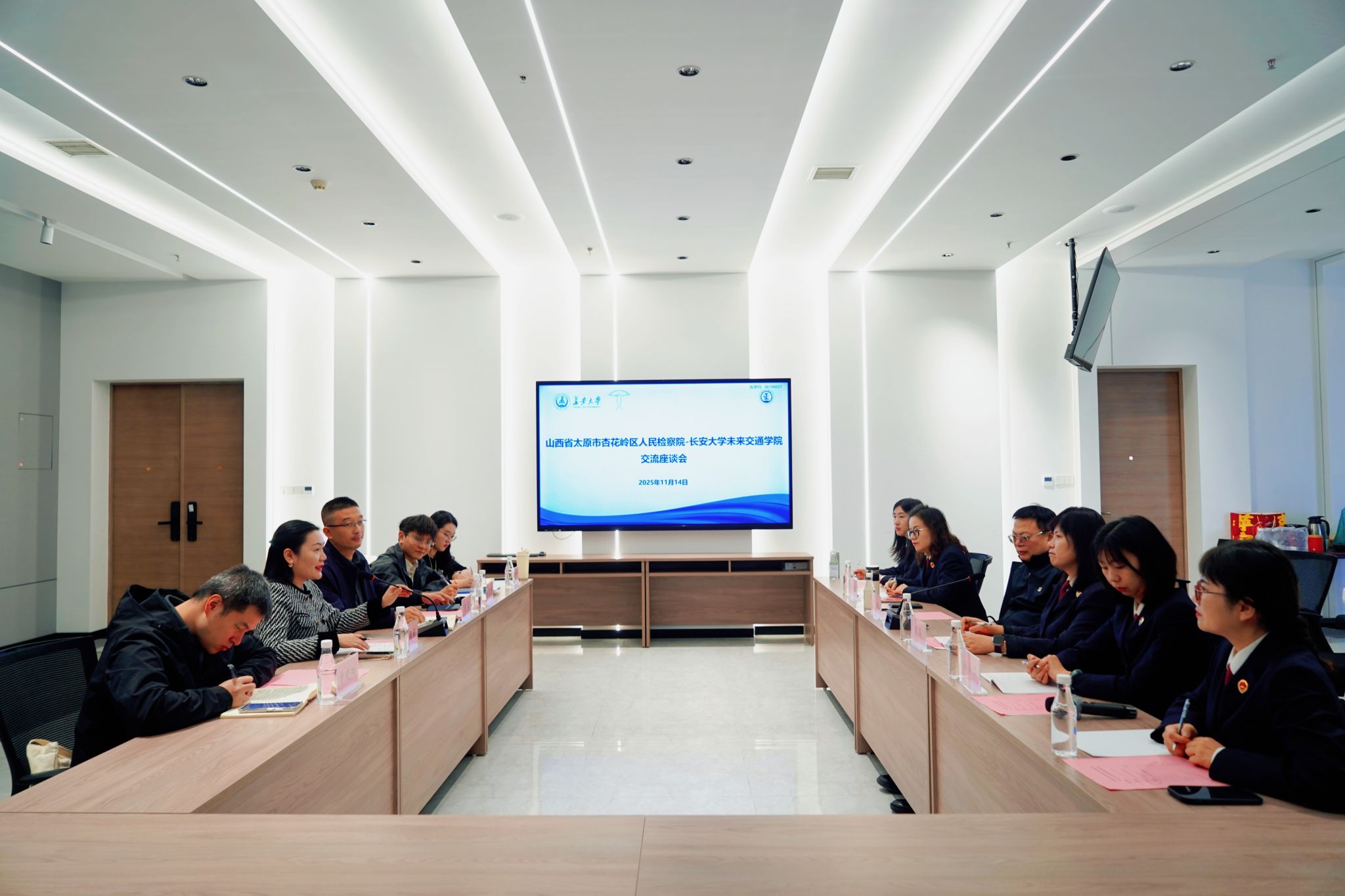 11月14日,山西省太原市杏花岭区人民检察院检委会专职委员李隆,第一检察部主任栾晶,副主任籍宏娟、白泽华等一行来访未来交通学院,就校地合作实践育人与大学生法治教育工作开展座谈交流,长安大学团委副书记常睿,法治与法务办公室法治科科长李若愚、法务科李婧琳,未来交通学院团委书记曾晓阳出席座谈会,会议由未来交通学院副院长汤颖颖主持。