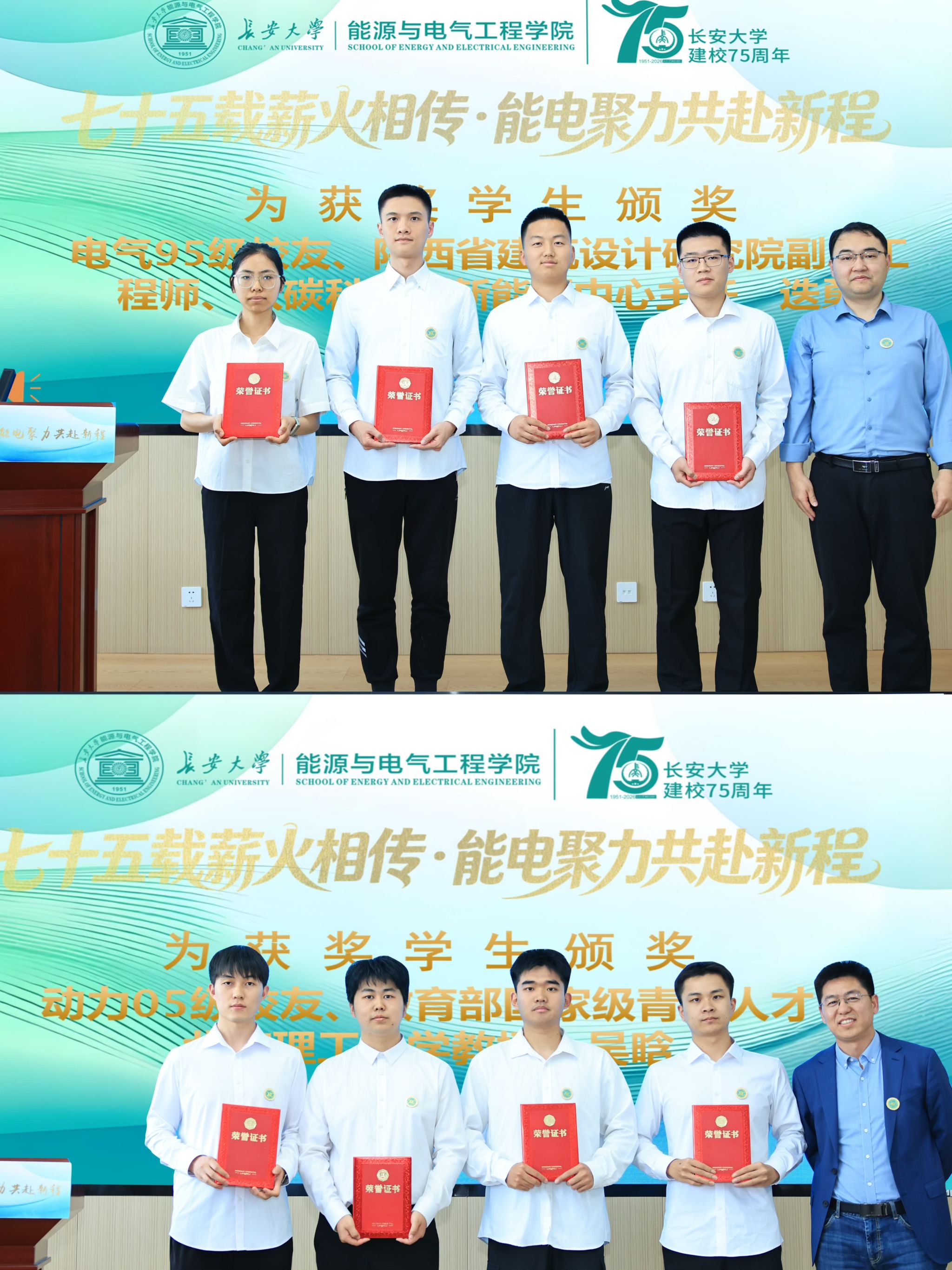 在学院“赋能·致远”基金项目启动仪式暨“优秀毕业生”社会奖学金颁奖仪式上,学院党委副书记刘飞宣读能电学院“赋能·致远”基金项目。学院段晨东教授宣读2026年“优秀毕业生”获奖学生名单;陕西省建筑设计研究院副总工程师、双碳科技与新能源中心主任1995级校友迭勇,教育部国家级青年人才、北京理工大学教授2005级校友吴晗为获奖学生颁发荣誉证书;中联西北工程设计研究院有限公司副总工程师1995级校友张海涛代表校友寄语学子;获奖学生代表、学院第三届学生会主席贺迪发表获奖感言。