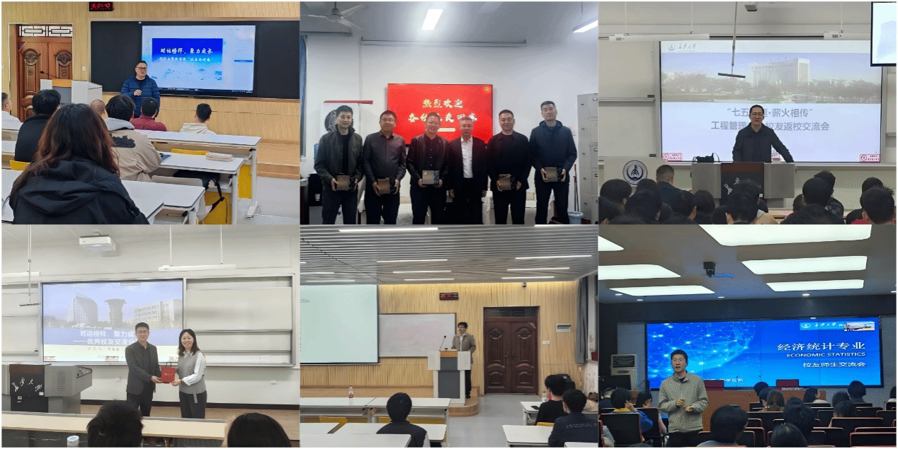 校友返校日前,经济与管理学院统筹安排,陆续举办多场“校友面对面”系列座谈会,工商管理系、物流系、经济系、会计系、管理科学与工程系和统计系分别邀请优秀校友、企业代表返校,解读行业趋势与用人需求,深化校企合作;结合行业实践,为学子提供行业指导;分享求职、升学、创业经验。校友结合自身经历,拆解发展路径要点,解答学子关于升学、职业规划、求职等疑问。学院领导及教师代表出席,欢迎校友返校,鼓励学子珍惜机会、明确方向。