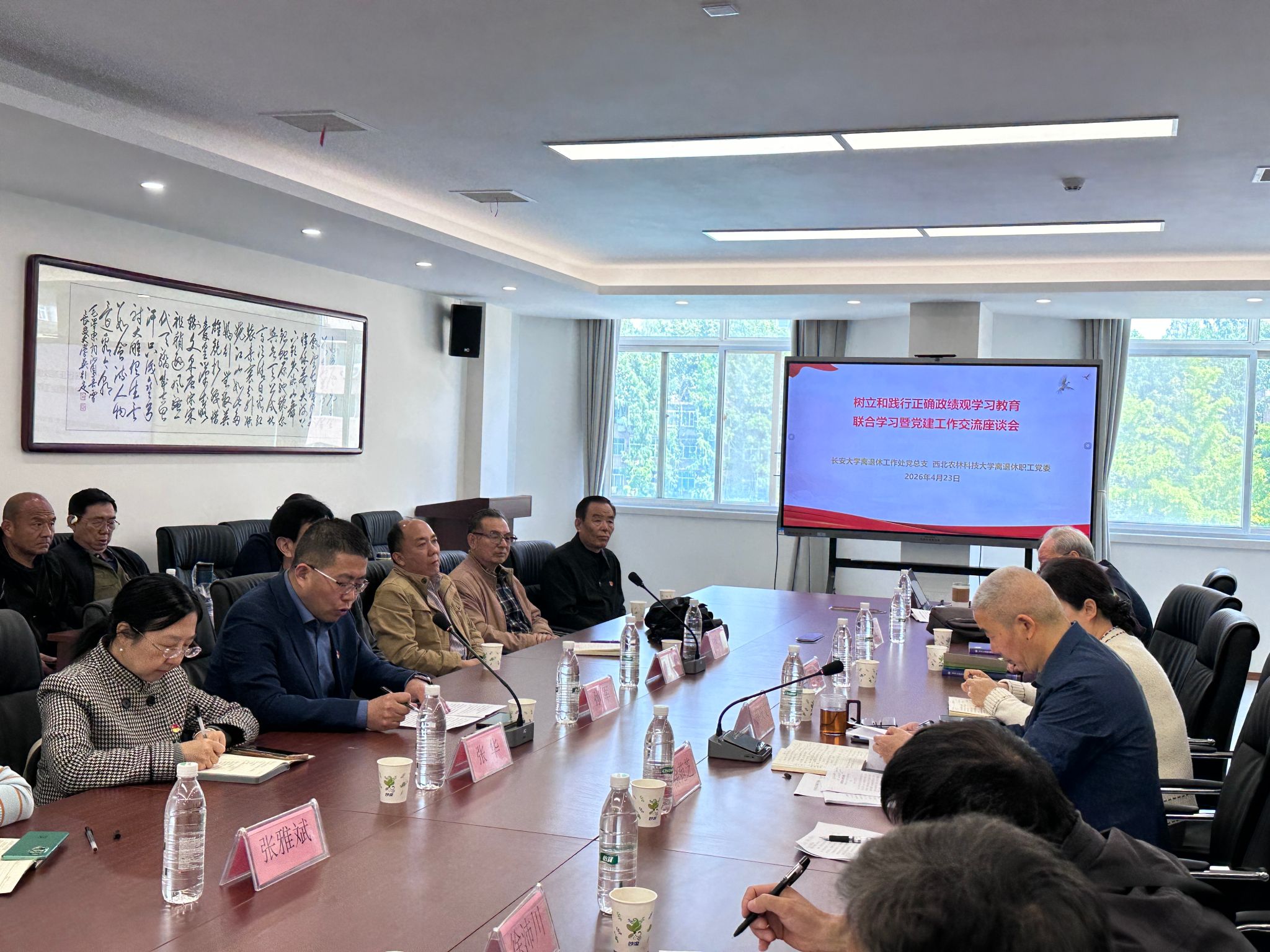 4月23日,我校离退休处党总支与西北农林科技大学离退休职工党委开展树立和践行正确政绩观学习教育联学暨党建工作交流座谈会。本次活动以“理论联学强根基、经验互鉴促提升”为宗旨,双方聚焦思想引领、精准服务及银发作用发挥等核心任务开展深度研讨,共同探索高校离退休工作高质量发展的实践路径。