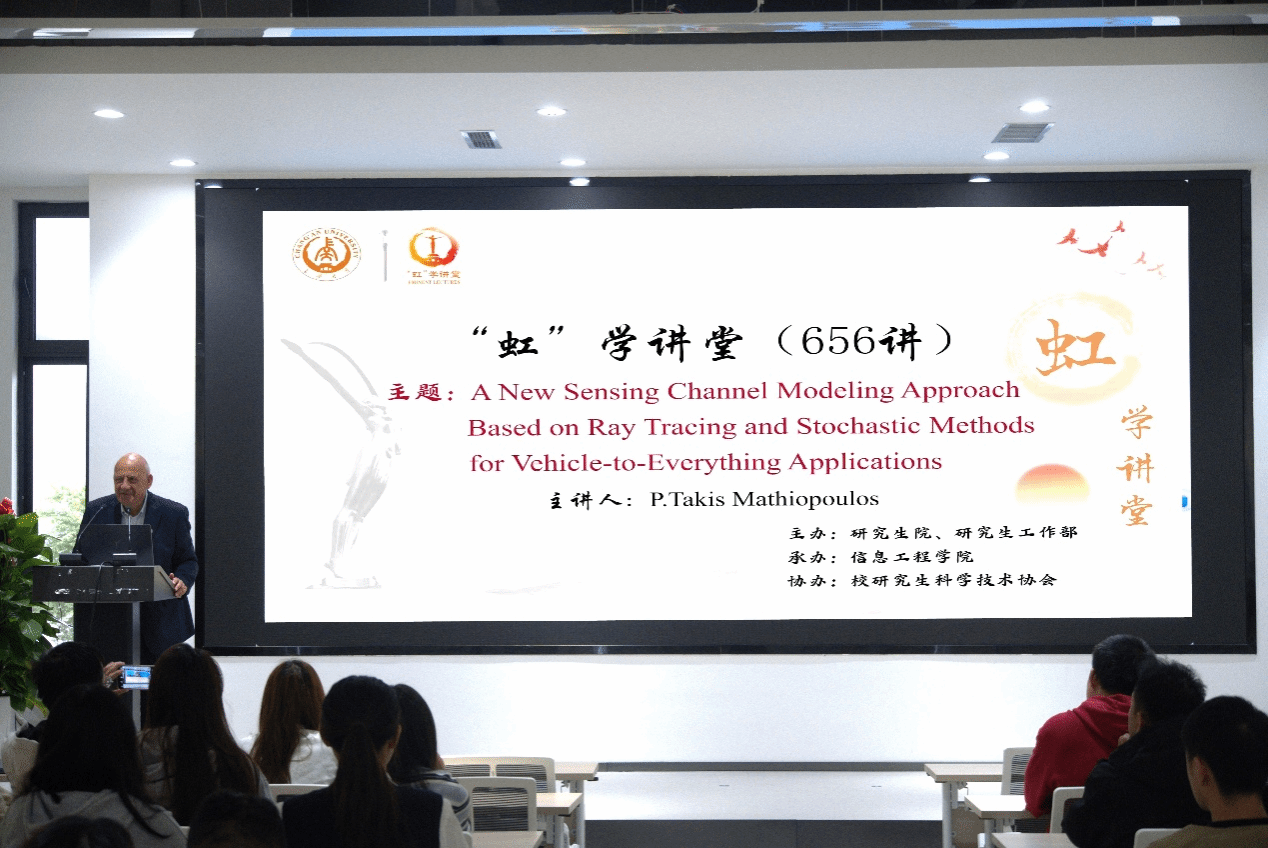 9月26日上午,由研究生院、研究生工作部主办,信息工程学院承办,校研究生科学技术协会协办的“虹”学讲堂656讲在北校区明德园创新大厦101报告厅举办。希腊雅典大学P.Takis Mathiopoulos教授作了题为“A New Sensing Channel Modeling Approach Based on Ray Tracing and Stochastic Methods for Vehicle-to-Everything Applications”的报告,信息工程学院副院长王威主持报告会,相关学院共120余名师生参加讲座。