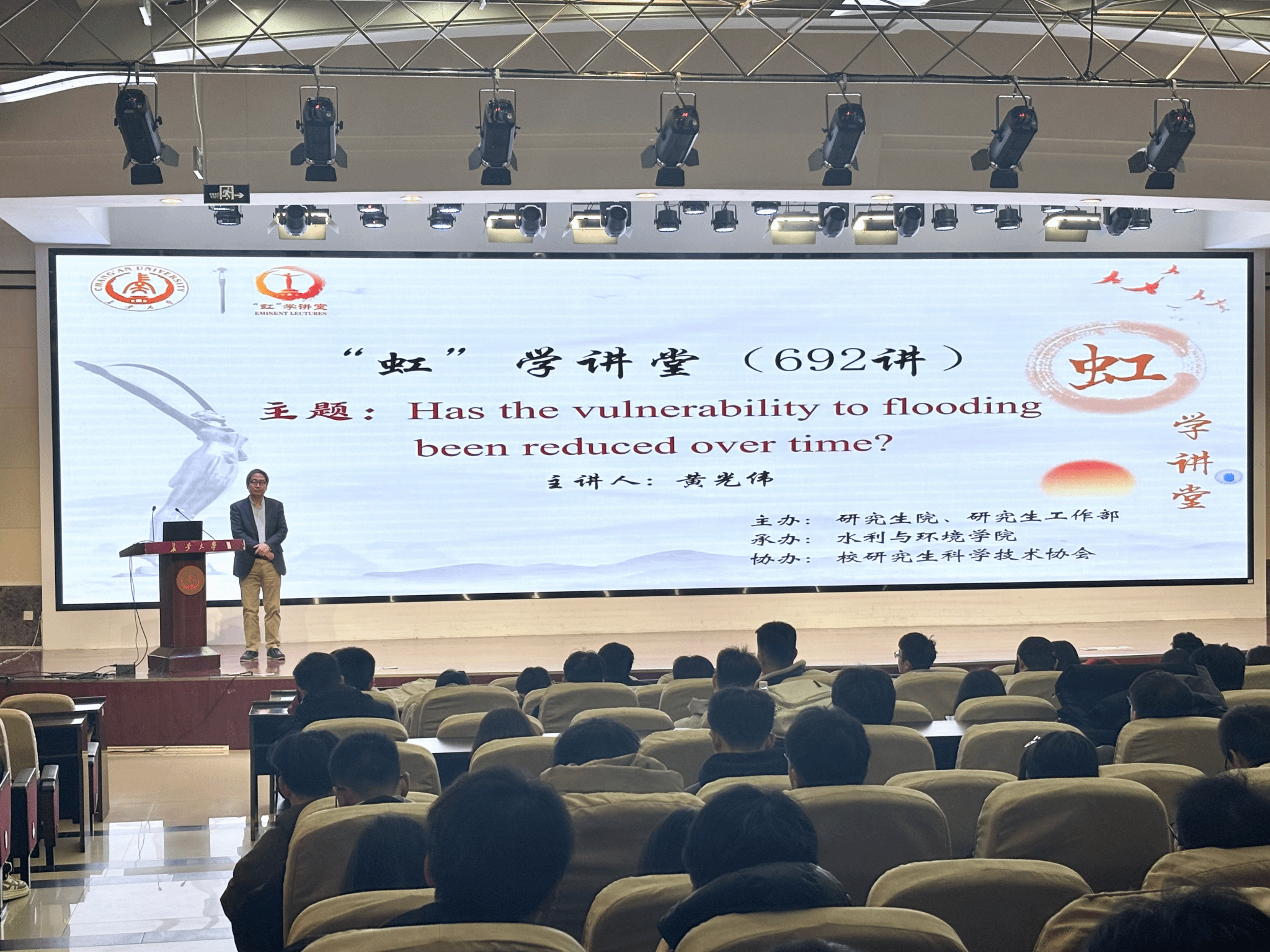 3月13日上午,由研究生院、研究生工作部主办,水利与环境学院承办,校研究生科学技术协会协办的“虹”学讲堂第692讲在南校区北院学术交流中心举办。上智大学黄光伟教授作题为“Has the vulnerability to flooding been reduced over time?”的报告,水利与环境学院罗平平教授主持报告会,相关学院共240余名师生参加讲座。
