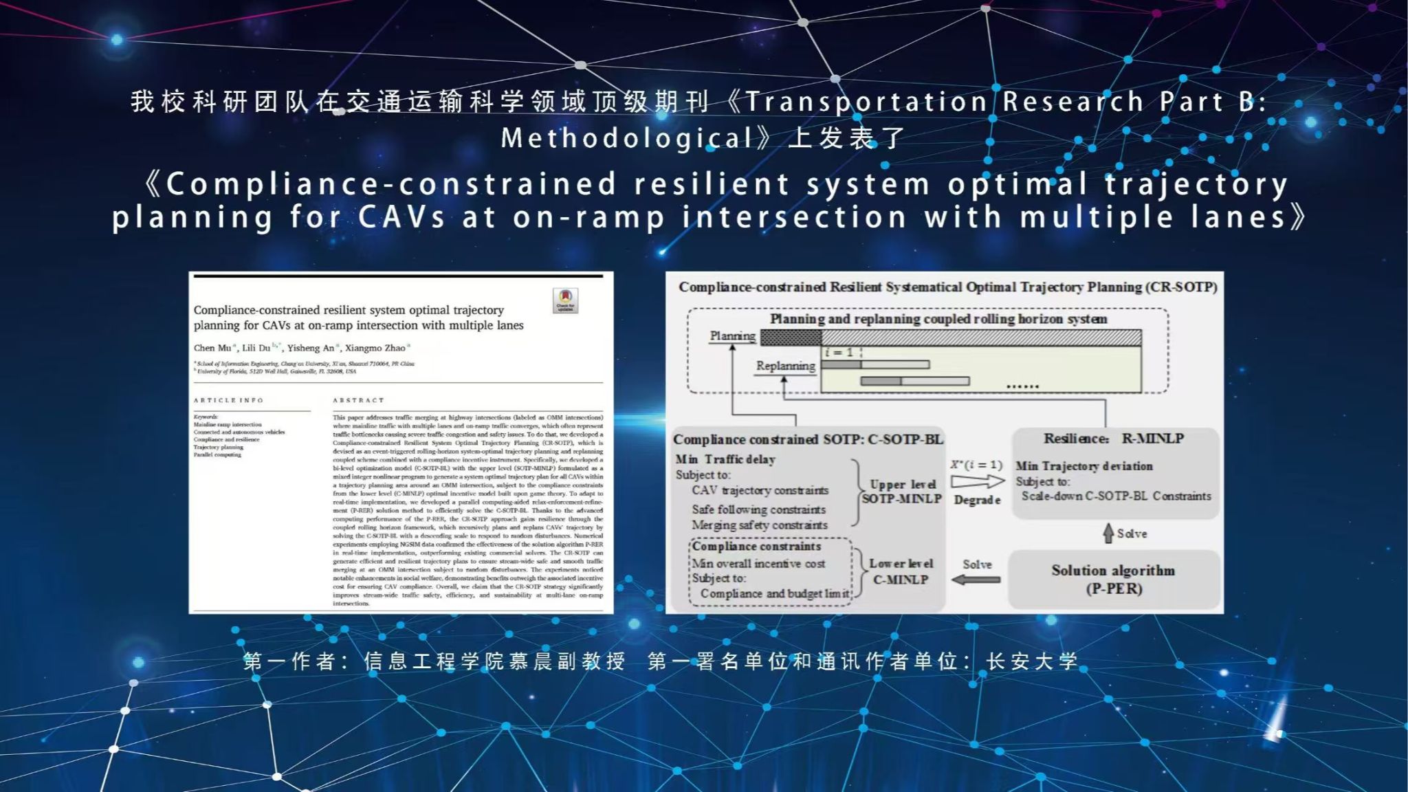 2月26日,我校科研团队在交通运输科学领域顶级期刊《Transportation Research Part B: Methodological》上发表了题为《Compliance-constrained resilient system optimal trajectory planning for CAVs at on-ramp intersection with multiple lanes》的研究论文。信息工程学院慕晨副教授为第一作者,长安大学为第一作者单位,实现了我校在该期刊上以第一作者单位发表论文的突破性进展。本研究聚焦于高速公路和城市快速干道的关键交通瓶颈—...