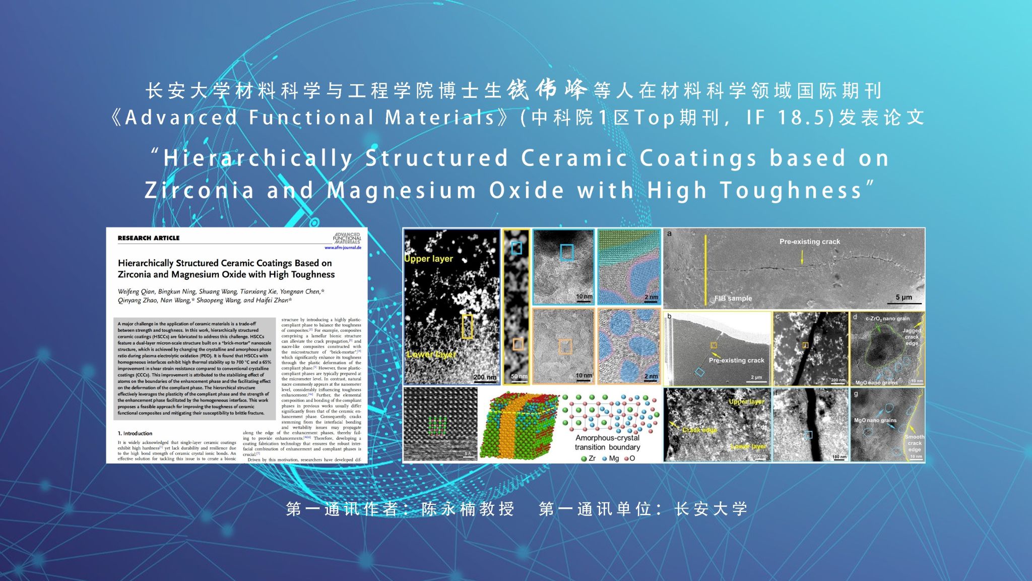 近日,我校材料科学与工程学院博士生钱伟峰等人在导师陈永楠教授的指导下,在材料科学领域国际期刊《Advanced Functional Materials》(中科院1区Top期刊,IF 18.5)发表论文“Hierarchically Structured Ceramic Coatings based on Zirconia and Magnesium Oxide with High Toughness”。陈永楠教授为第一通讯作者,长安大学为第一通讯单位。陶瓷材料应用中的一个主要挑战是强度和韧性之间的权衡。此研究通过构建多尺度异构结构陶瓷涂层(...