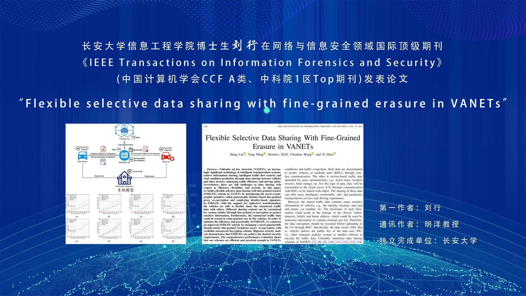 近日,我校信息工程学院博士生刘行在导师明洋教授的指导下,在网络与信息安全领域国际顶级期刊《IEEE Transactions on Information Forensics and Security》(中国计算机学会CCF A类、中科院1区Top期刊)发表论文“Flexible selective data sharing with fine-grained erasure in VANETs”。明洋教授为通讯作者,博士生刘行为第一作者,长安大学为独立完成单位。车联网能够通过车辆和其他设备的数据共享实现智能交通流控制和路况预测,...