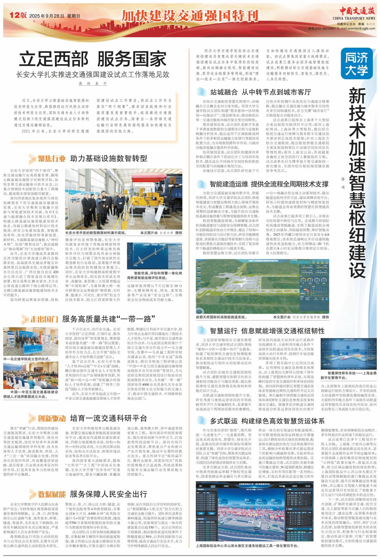《中国交通报》在“加快建设交通强国特刊”推出《立足西部 服务国家——长安大学扎实推进交通强国建设试点工作落地见效》专题报道,围绕“聚焦行业 助力基础设施数智转型”“走出国门 服务高质量共建‘一带一路’”“创新驱动 培育一流交通科研平台”“数据赋能 服务保障人民出行安全”四部分,全面介绍学校立足交通运输学科特色、服务国家重大战略的探索实践。