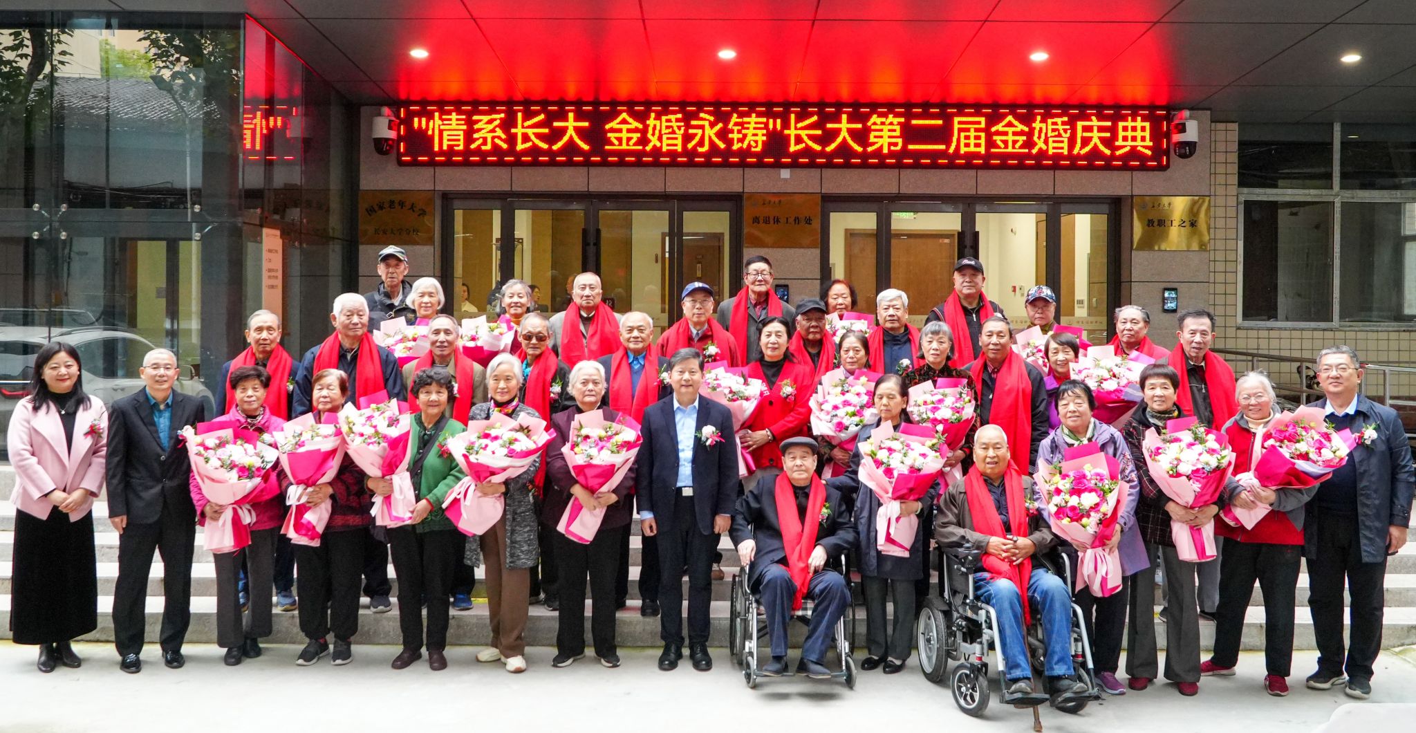 为弘扬中华民族传统美德,倡导和谐婚姻家庭观念,表达学校对老同志的温馨关怀,10月22日,“情系长大 金婚永铸”长安大学第二届金婚庆典在南校区师生活动中心一楼多功能室举行,副校长黎开谊出席活动并致辞,离退休工作处班子成员、翠华幼儿园园长王珩、17对金婚夫妇、老同志代表、幼儿园老师和小朋友代表参加活动。活动由离退休工作处处长薛庆文主持。
