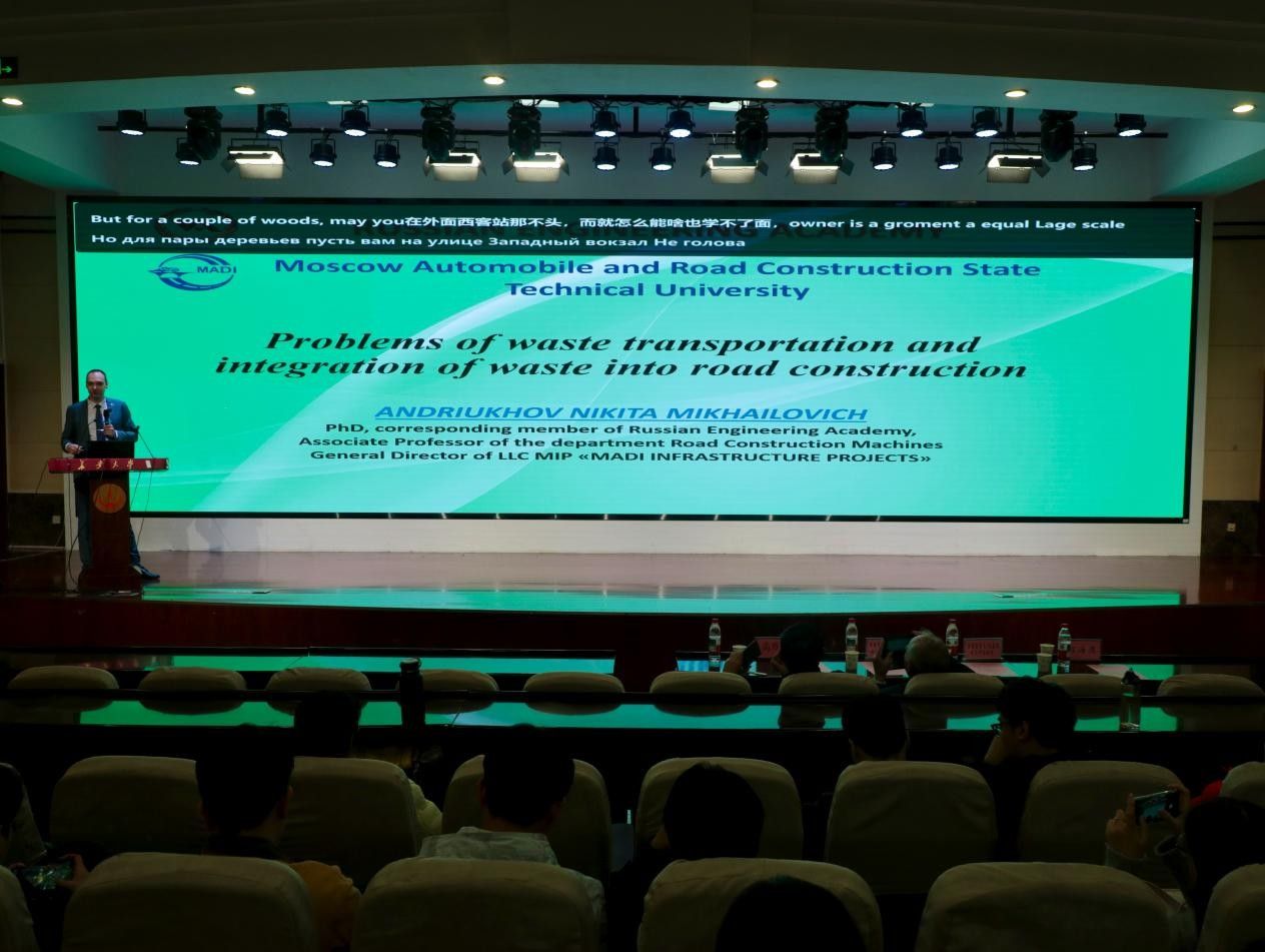 会上邀请了俄罗斯工程科学院院士库斯塔列夫・根纳季・弗拉基米罗维奇和通讯院士安德留霍夫・尼基塔・米哈伊洛维奇分别作了题为“沥青混凝土路面高效施工技术与创新工艺及研究展望”“垃圾收集与运输问题的创新解决方案及废弃物在道路建设中的资源化利用”的报告。库斯塔列夫・根纳季・弗拉基米罗维奇院士的报告主要围绕沥青混凝土路面的施工技术、创新工艺两个方面展开。他回顾了苏联道路机械发展史,提出了解决温度离析高速连续摊铺难题的工艺,以及热再生、冷再生修复技术,同时介绍了利用超声波系统清除土壤石油污染的方法,并展示了移动式处理复合体与路面标线的清洁装置。安德留霍夫・尼基塔・米哈伊洛维奇通讯院士的报告主要围绕垃圾收运难题创新解决及废弃物在道路建设中的资源化利用两个方面展开。他指出了全球垃圾产量持续增长,传统收集运输方法效率有限,在此基础上提出了基于流变学的垃圾压实理论,设计了平移与平移旋转两种压实方式的试验台,对比解释了平移旋转对压实密实比的显著提高效果,为将垃圾整合到道路建设中的资源化利用提供了技术依据。