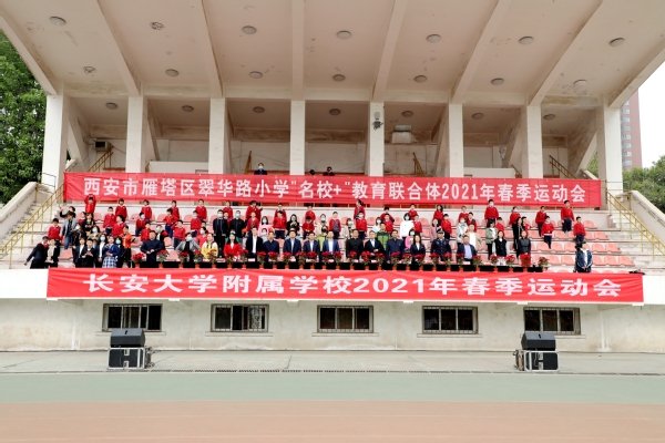 在长安大学喜迎70周年校庆之际,4月15日,附属学校2021年春季运动会开幕式在南校区北院操场举行,附属学校、翠华路小学名校+教育联合体一至九年级3000余名师生共同参与了这场体育赛事。校党委副书记、副校长彪晓红,雁塔区教育局党委副书记侯自忠、副局长杨勇,党办主任李国光、附属学校党总支书记郭自立、基础教育办公室/附属学校校长雷显锋、名校+教育联合体总校长杨俊峰,省委机关、雁塔区教育局、陕西科技大学、西安财经大学等相关部门领导出席了开幕式。