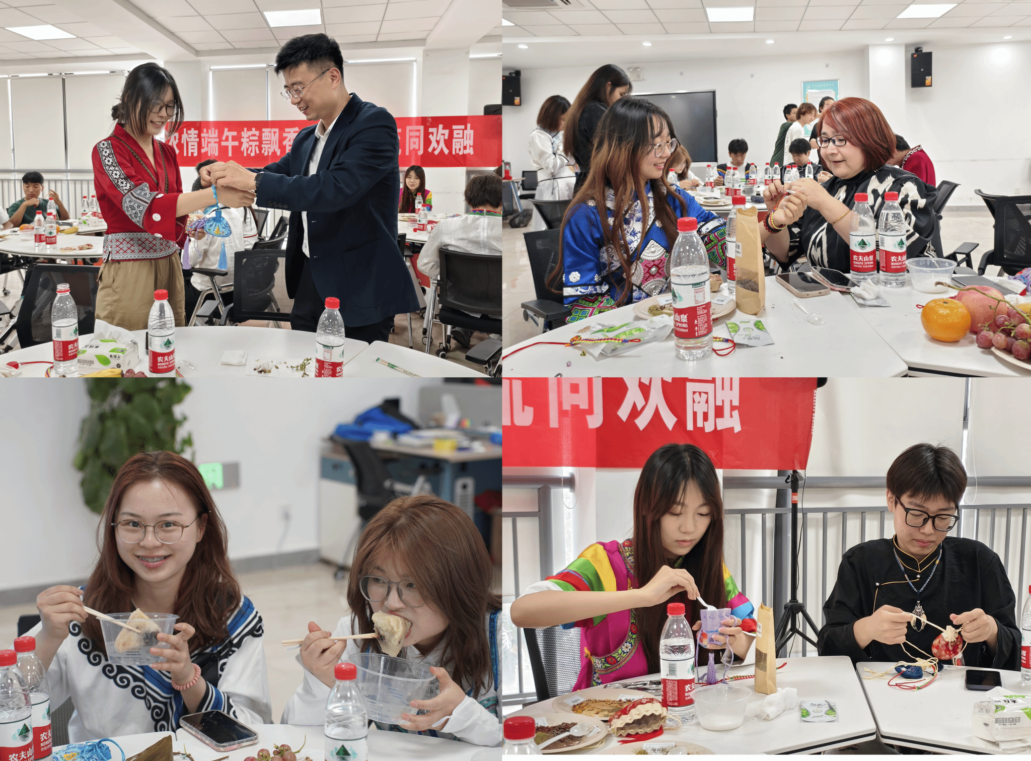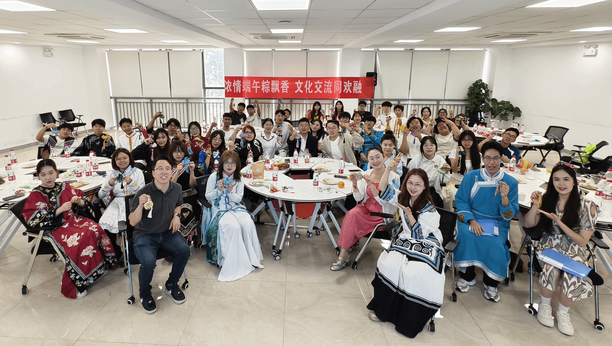 活动伊始,主持人通过科普视频向参与活动的老师和同学详细介绍了端午节的习俗及其蕴含的深厚文化内涵。伴随着悠扬动听的蒙古族歌曲《鸿雁》,热气腾腾的粽子摆上了桌。厚重的粽叶难掩糯米的醇香,师生一起品尝粽子,共同制作寓意健康平安的香包并互相赠送,五彩的丝线、翠绿的粽叶与阵阵欢声笑语交织在一起,现场气氛温馨而愉快。