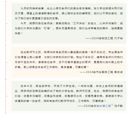 三是营造浓厚氛围,弘扬立德树人“主旋律”。通过横幅标语、橱窗海报、电子屏幕等方式开展庆祝第41个教师节主题宣传活动,全方位展示学院广大教师在教书育人过程中担当作为、爱岗敬业、甘于奉献的感人事迹,加强节日氛围营造。“汽宇不凡”微信公众号面向学生征集“教师节祝福语”,推出《令公桃李满天下,何用堂前更种花》微信专辑,向教师们送上节日祝福。