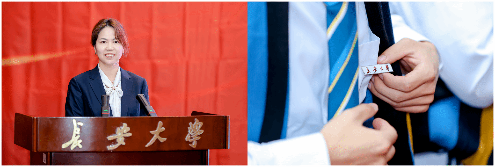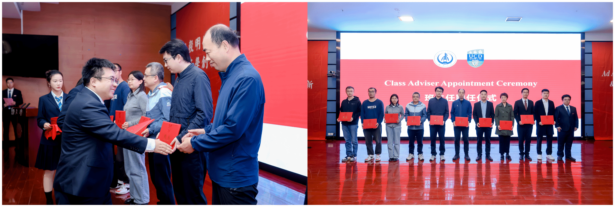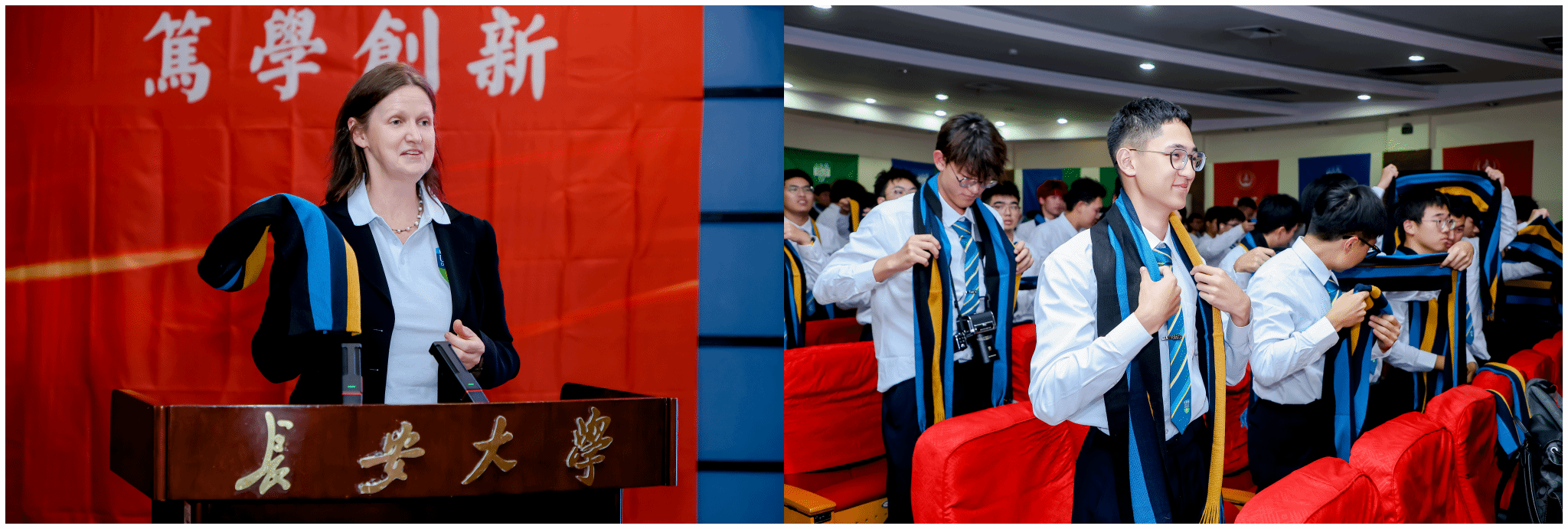 在新生班主任聘任环节,张久鹏为各位班主任颁发聘书,勉励班主任们为同学们提供全方位的精细化教育管理。学院副教务长Catherine MacKenzie主持都柏林大学围巾授予仪式,围巾的授予,代表着2025级新生获得了都柏林大学学籍,也意味着大家因共同的学术追求、团队合作和友谊而紧密联结。学院党总支副书记张艳萍主持长安大学校徽佩戴仪式,一枚枚校徽成了全体2025级新生继承和弘扬长大精神、与学校同奋进、与学院共成长的光荣象征。