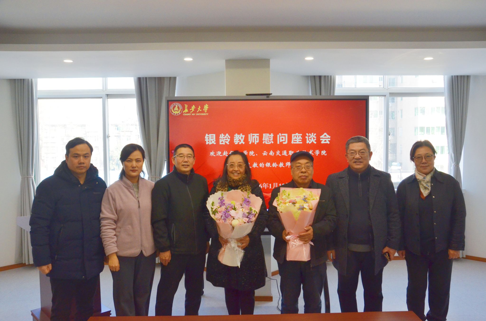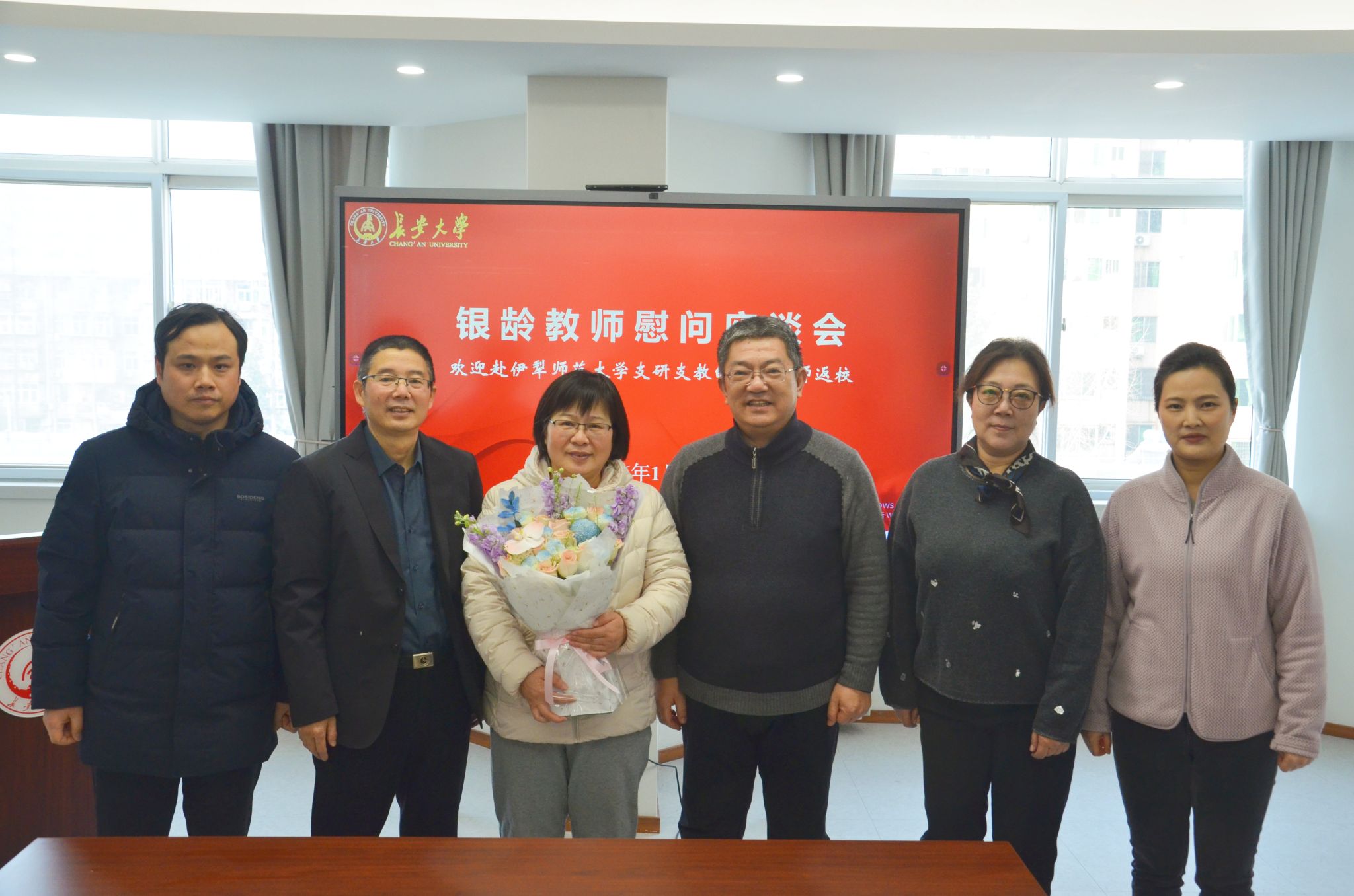 为弘扬尊师重教的优良传统,把温暖与敬意送到银龄教师心坎上,2026年1月中旬,离退休工作处开展慰问返校银龄教师活动,离退休处班子成员为十余位银龄教师送上鲜花、慰问品和新春祝福,让其感受到学校的敬意、关怀与温暖。