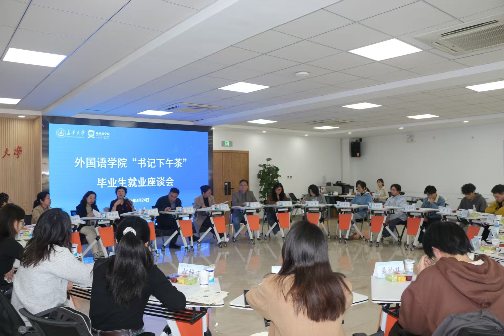 3月24日下午,外国语学院在朝晖园社区二层团体活动室召开“书记下午茶”毕业生就业座谈会。学院党委书记张永、党委副书记勾小群、副院长马瑛,英语系主任赵斌,日语系主任韩春娟,外国语言文学教育中心主任茹英,学院专业建设及教学主管张侠侠,研究生毕业班辅导员程馨及研究生、本科生毕业生代表参加座谈。会议由学院团委书记、毕业班辅导员杨文佳主持。