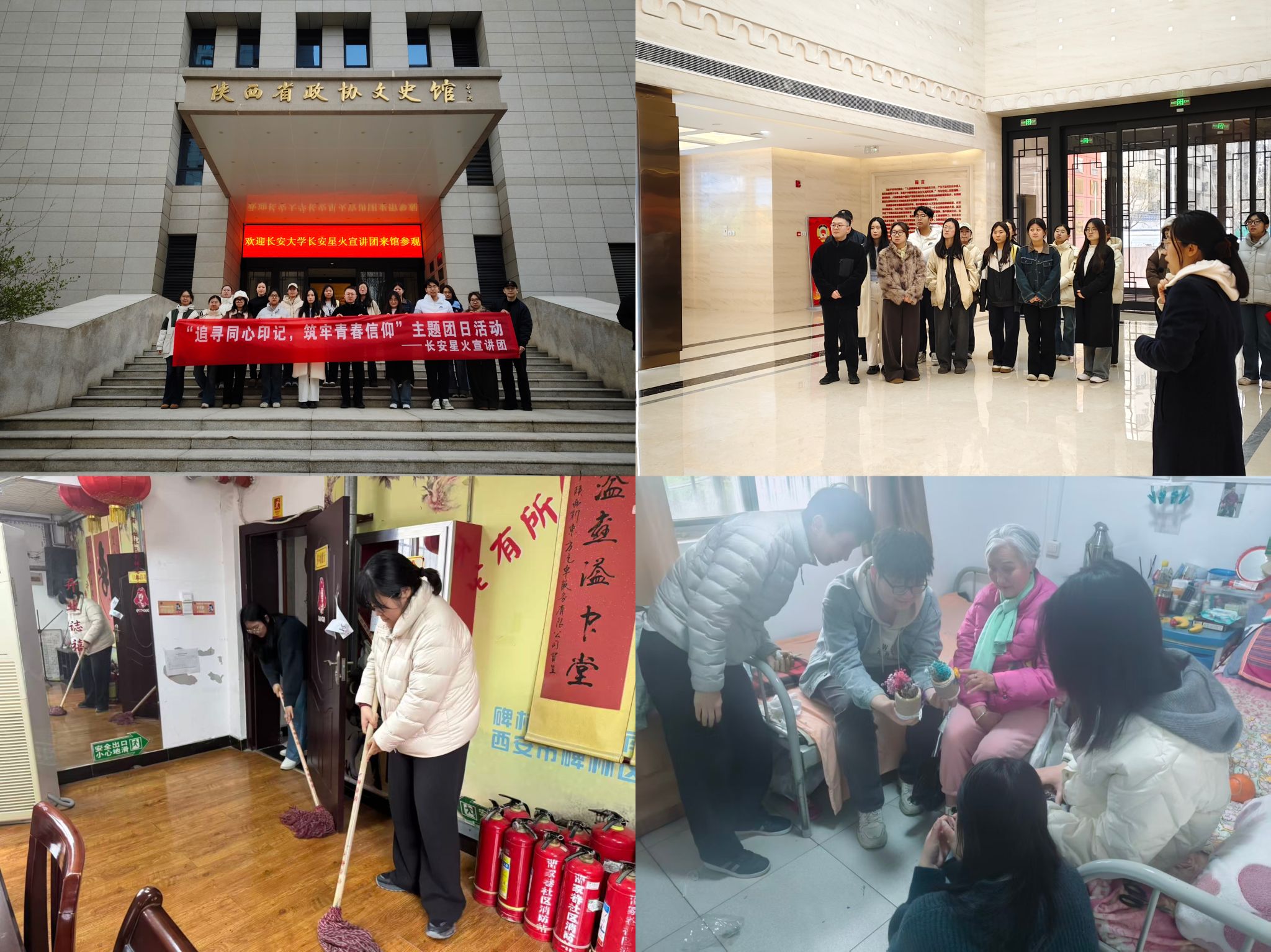 聚力社会服务,让雷锋精神彰显担当。学院坚持“思政小课堂”对接“社会大课堂”,组织志愿者走进碑林区金辉老年爱心护养院,通过谈心交流、环境清扫、爱心陪伴等形式,为老人送去温暖,传承尊老敬老美德;依托长安星火宣讲团,走进陕西省政协文史馆开展主题团日活动,结合全国两会精神,将雷锋精神与理想信念教育融合,锤炼学子理论素养与宣讲本领,让奉献精神在基层服务中落地见效。