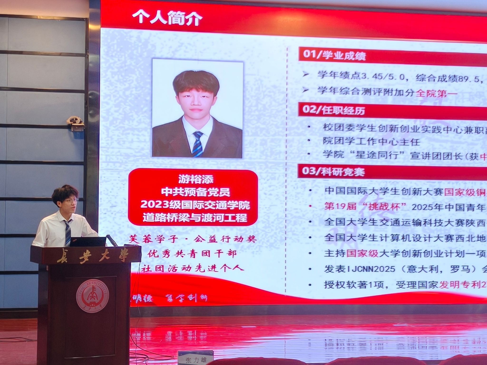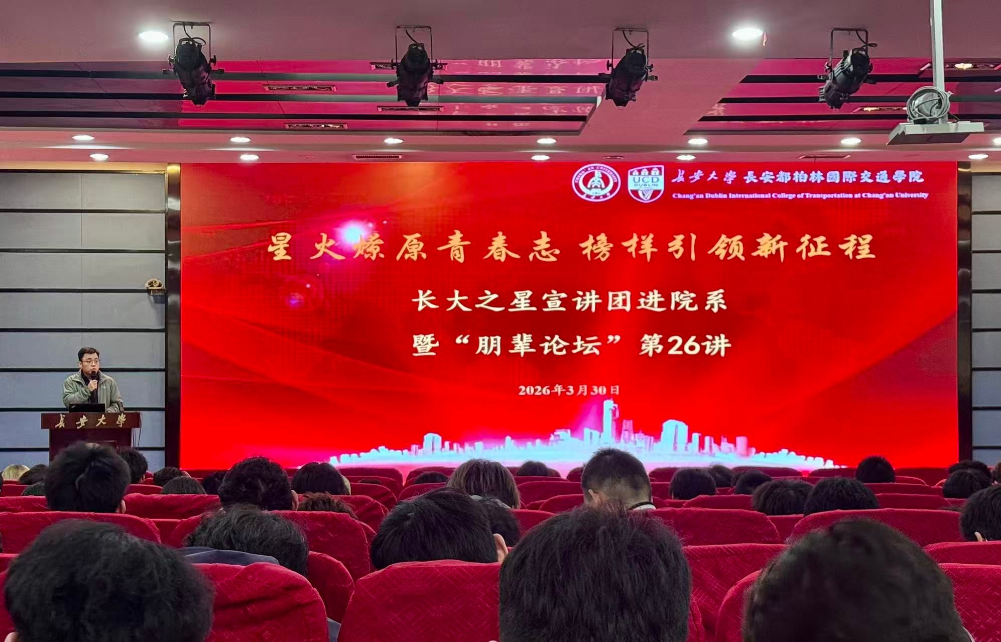 为充分发挥朋辈榜样示范引领作用,营造奋发向上的优良院风学风,3月30日,长安都柏林国际交通学院举办“长大之星”宣讲团进院系活动暨“朋辈论坛”第二十六讲。2025级全体本科生,辅导员张力雄、惠亦嘉参加宣讲会。活动由张力雄主持。