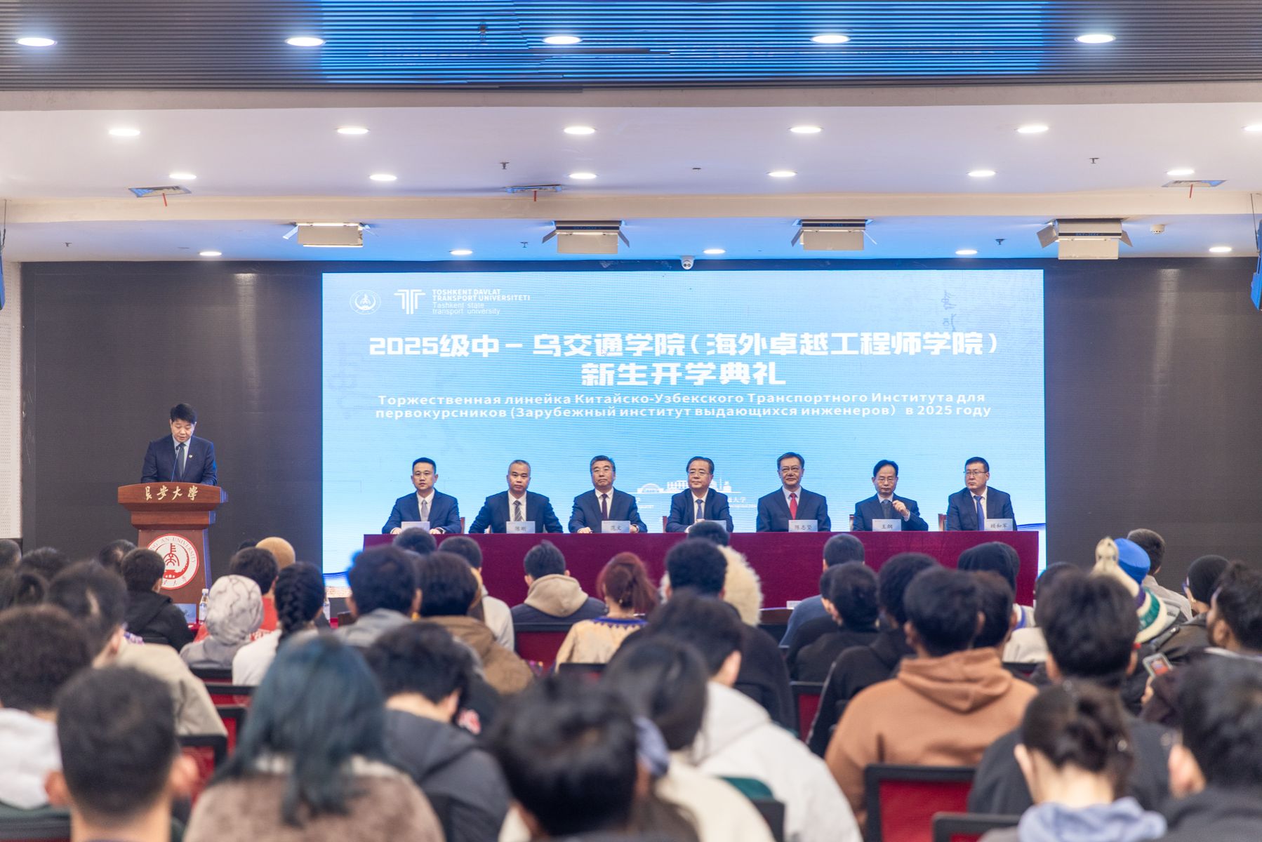 典礼现场气氛庄重而热烈。陕西省委教育工作委员会副书记王海波、长安大学党委书记陈志坚、副校长范文教授出席典礼。陕西省教育厅、省外办、西安市教育局等相关单位负责人,乌兹别克斯坦塔什干国立交通大学师生代表,以及学校相关学院与职能部处负责人、教师代表与首届全体新生参加典礼。长安大学国际教育学院院长张伟主持典礼。