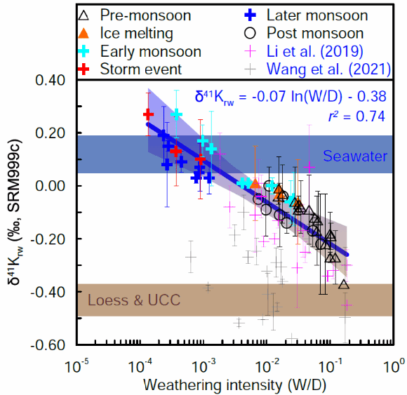 研究表明,河水中的溶解态的K不仅主要来自于硅酸盐岩风化,还首次在季节尺度上发现巨大的钾同位素分馏,由此打通了河水δ⁴¹K用以示踪空间上和季节上的硅酸盐岩风化强度的链条。后续可能可以通过海洋粘土矿物的K同位素对地球历史上不同时期的硅酸盐岩风化强度进行重建,进而理解地球是如何通过化学风化的调节为我们提供了一个恒温、恒压、恒氧、恒大气碳的“完美温室”。海洋钾同位素变化也可以完全由化学风化来解释,同时解决了化学风化的示踪和海洋钾同位素的变化难以解释两大难题。