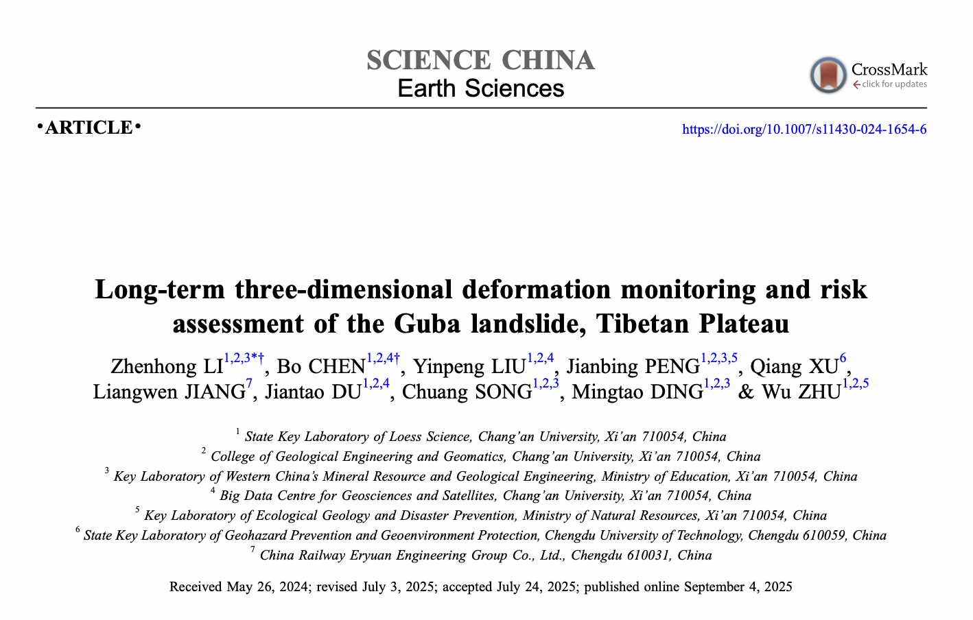 在国家自然科学基金重大项目(批准号:41941019)的资助下,长安大学李振洪教授团队与成都理工大学许强教授、中铁二院蒋良文副总工程师合作,在人迹罕至高位远程滑坡长时序三维监测和风险评估方面取得新进展。相关研究成果以“青藏高原古巴滑坡长时序三维形变监测和风险评估”为题,于2025年9月3日发表于《中国科学:地球科学》(Science China Earth Sciences)杂志,通讯作者为长安大学李振洪教授,共同第一作者为陈博博士。文章链接:https://doi.org/10.1007/s11430-024-1654-6.