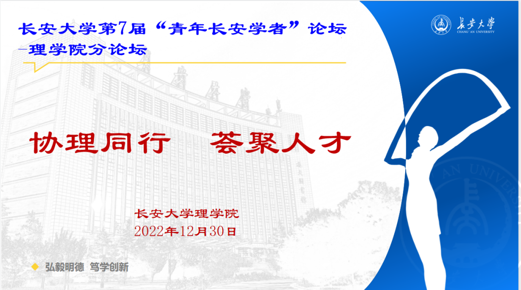 12月30日,长安大学第七届“青年长安学者”论坛理学院分论坛“协理同行,荟聚人才”成功在线举办,来自海内外高校的青年学者与理学院师生相聚云端。学院全体院领导、数学系、信计系、统计系和力学系系主任、教师共30余人参加论坛,论坛由院长助理邓庆田主持。