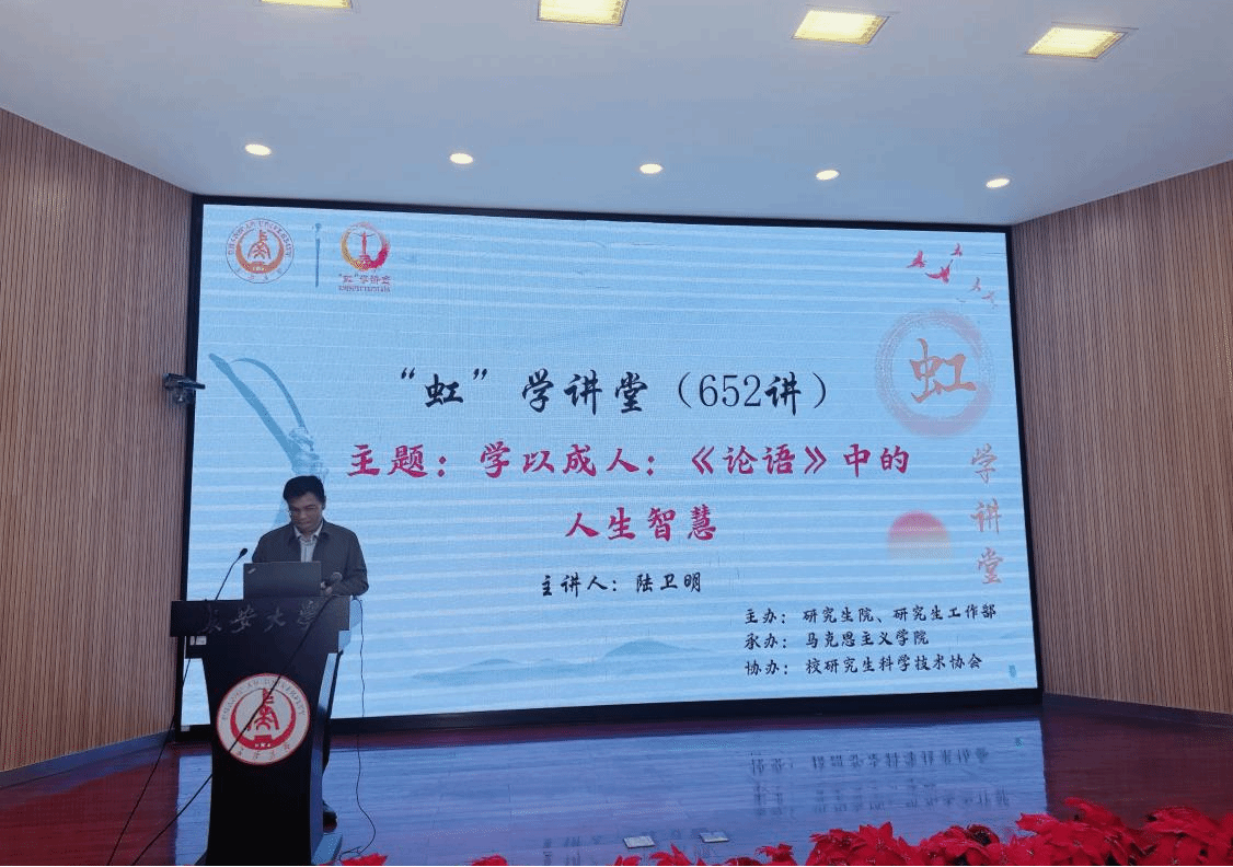 9月18日上午,由研究生院、研究生工作部主办,马克思主义学院承办,校研究生科学技术协会协办的“虹”学讲堂第652讲在南校区东院伯声报告厅举办。西安交通大学陆卫明教授作题为“学以成人:《论语》中的人生智慧”的报告,马克思主义学院王立洲教授主持报告会,相关学院共150余名师生参加讲座。