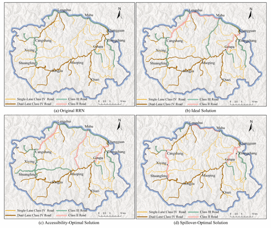 该研究提出了一种兼顾网络可达性与空间溢出效应的农村公路网络优化方法,旨在为乡村振兴战略提供科学的道路规划依据。论文以行政村为最小单元,采用时变空间权重矩阵表征农村公路网络,构建空间计量经济模型并进行参数估计,在此基础上将实证结果嵌入优化目标函数,形成同时考虑可达性与空间溢出效应的双目标优化模型,并采用NSGA-Ⅱ算法进行求解。研究结果表明,农村公路网络同时存在正向与负向的空间溢出效应,若在优化过程中忽视空间溢出效应,可能削弱农村经济活力并阻碍城乡融合发展。此外,研究发现与静态空间权重矩阵相比,时变空间权重矩阵能够更为准确地刻画农村公路网络的空间溢出效应。这一成果为优化农村公路网络设计、促进城乡经济协调发展提供了有益的方法论借鉴与实践参考。