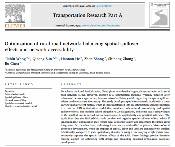 近日,我校经济与管理学院孙启鹏教授课题组在交通运输科学领域顶级期刊《Transportation Research Part A: Policy and Practice》上发表了题为《Optimization of rural road network: balancing spatial spillover effects and network accessibility》的研究论文。孙启鹏教授为论文通信作者,其博士生王佳彬为第一作者,长安大学为第一作者单位。